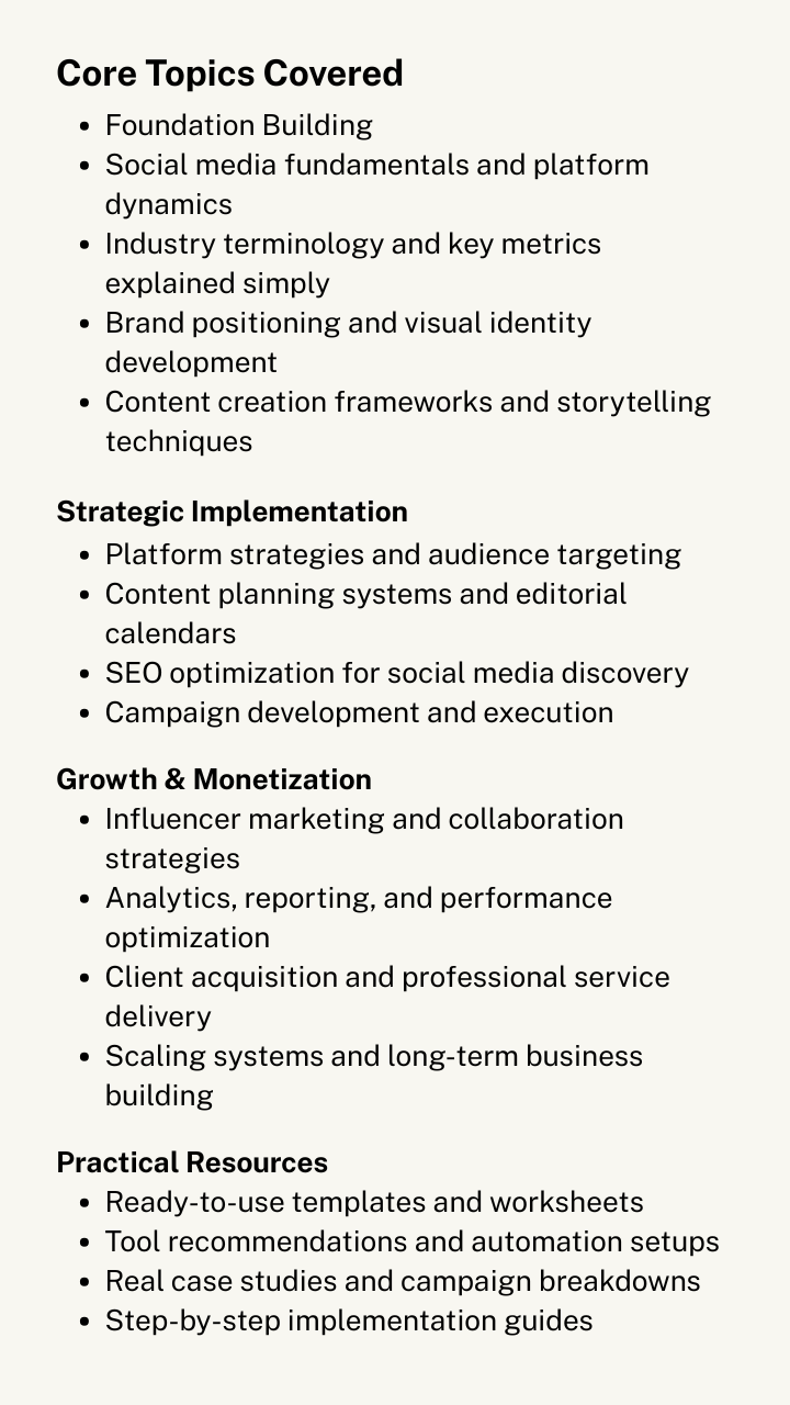Good for someone who wants to start social media marketing. The pricing confidence note for beginners was really good and the client process overview too. Took me some time to go through, but the guide itself feels very friendly. Gives a solid Roadmap fora beginner. The client process guide explains how to handle a client neatly and get them converted. From start to finish it tells you how to setup social media guide for a brand or business.How to create content and make it more compelling. How to grow your social media, some strategies for it. How to keep up with trends and stay updated. The second part focuses on building systems, organization, Clients handling pricing. Solid stuff covers fundamentals in detail.